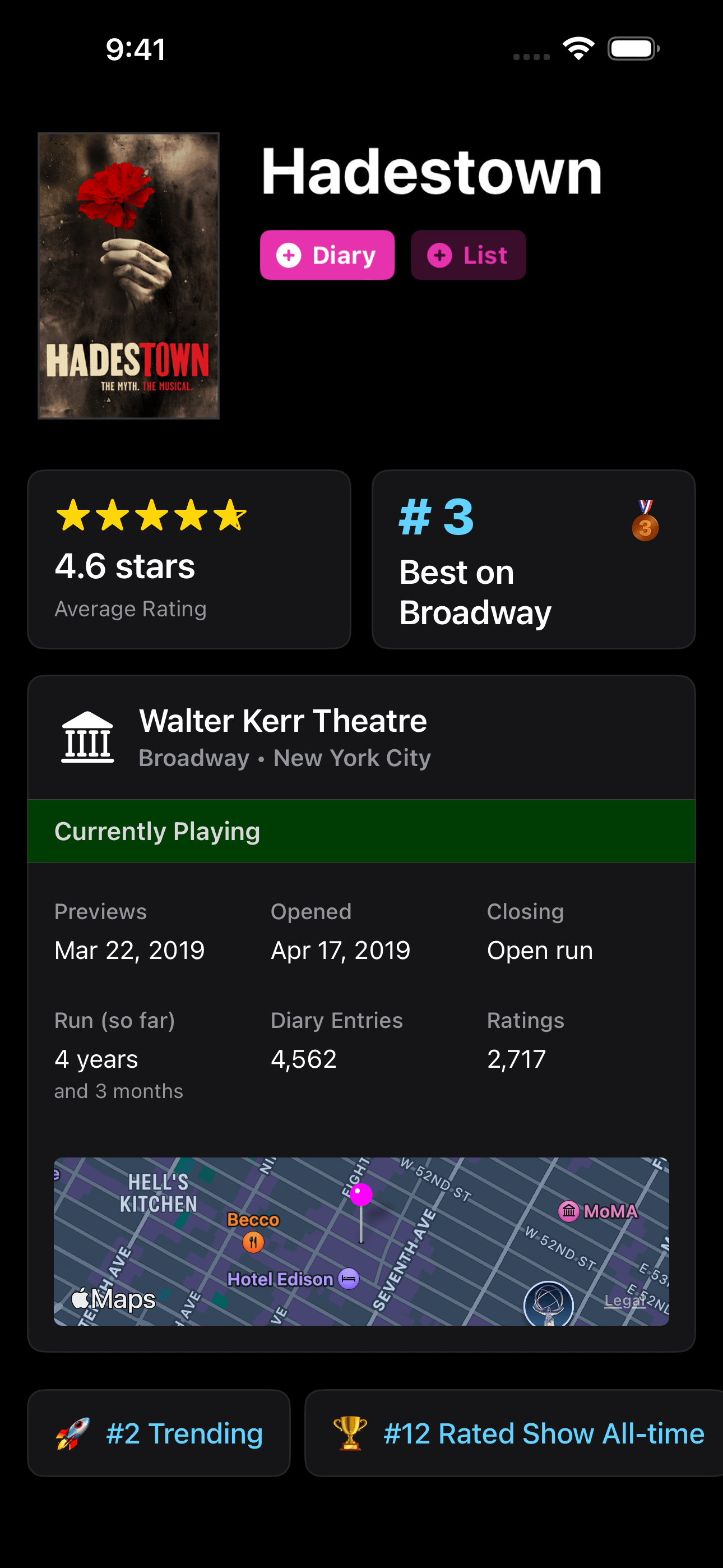 - Stats about the percentage of Broadway and West End theaters you have visited so far, with additional lists of the theaters you have visited, the shows you saw there, and what’s currently playing at the theaters you haven’t made it to yet.