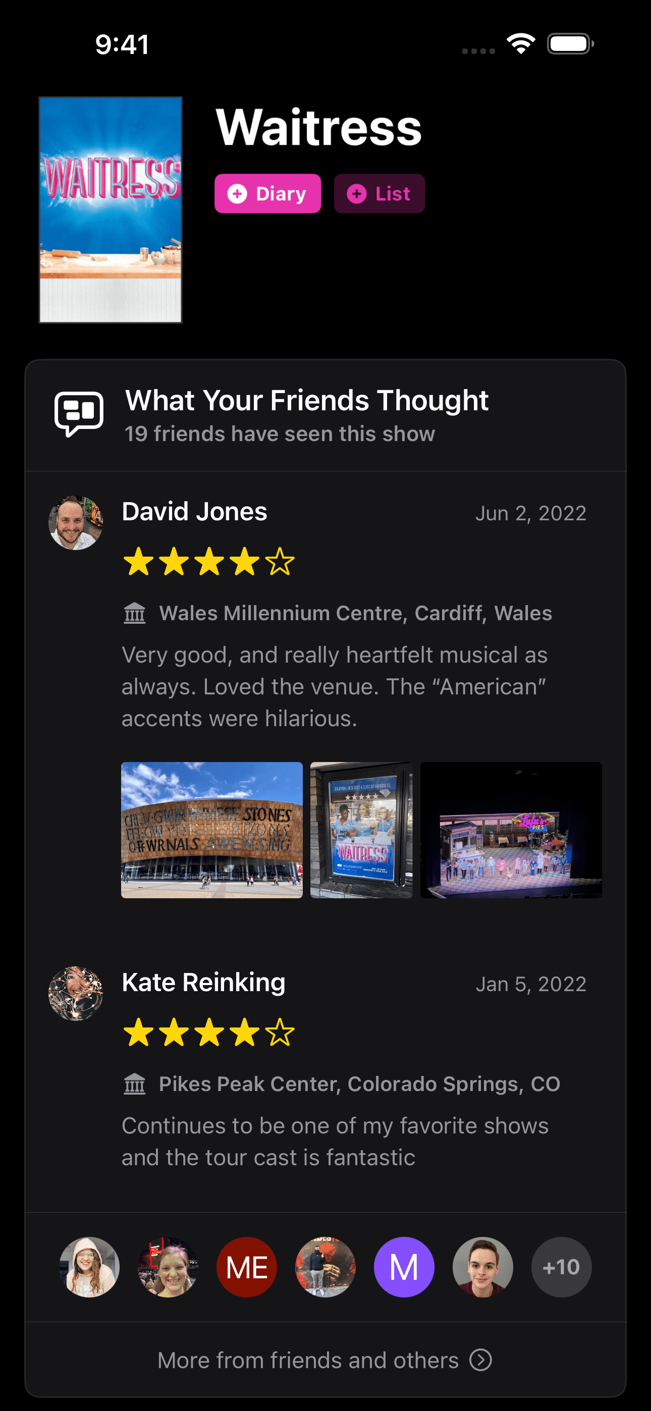 - Tap on a show or production in the 'Discover' tab or in one of your lists to view its reviews.